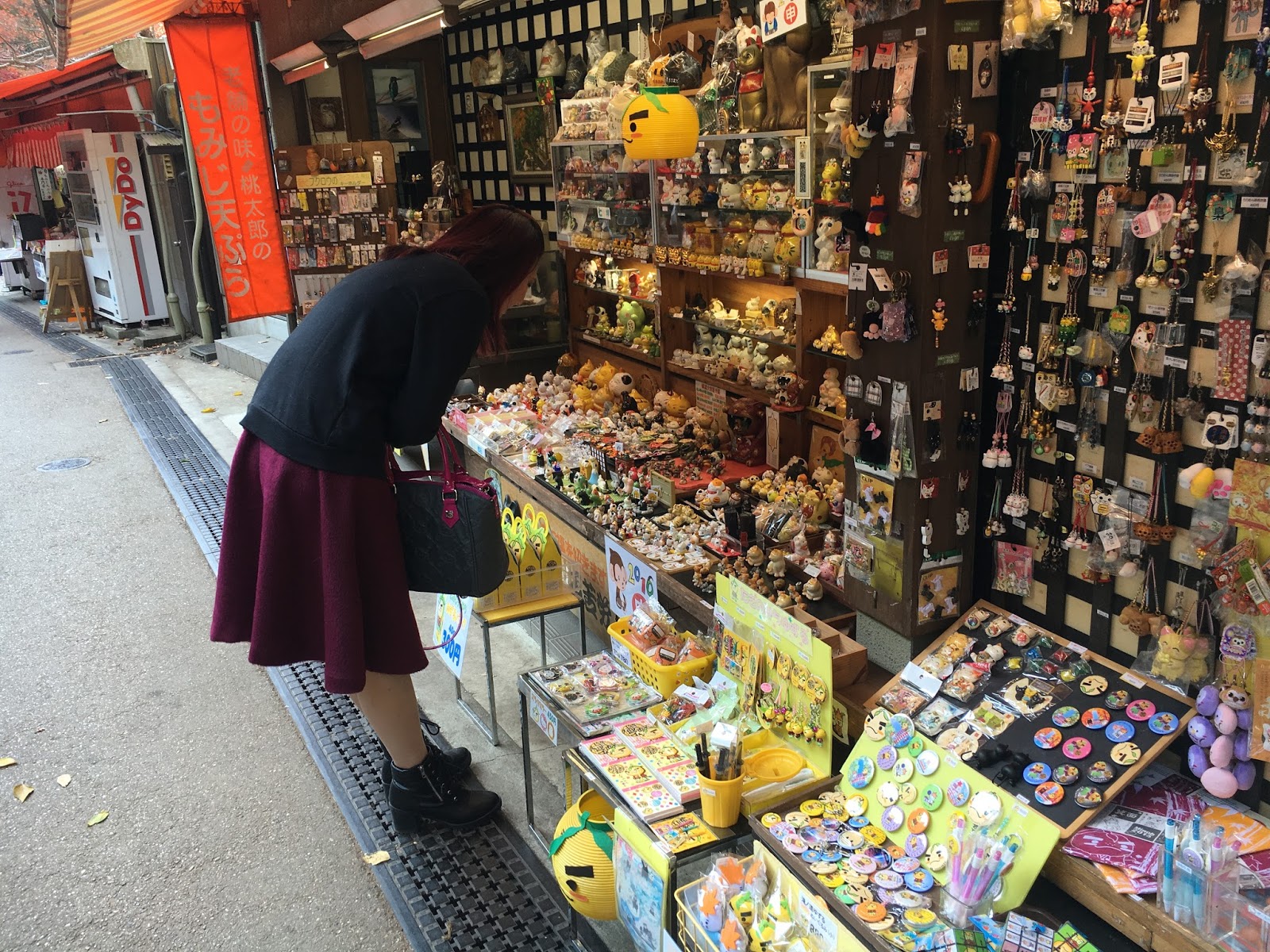 Once we returned to the origin of the trail, we stopped to get momiji tempura - the real reason we came to Minoo Park thanks to a heads up from Universal Doll. Shops on both sides of the street between the trail and the station are filled with vendors selling this special autumn treat which Minoo is known for.