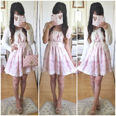 Liz Lisa flower dot OP, Liz Lisa x Yui Kanno collab rose drop cardigan, Liz Lisa pearl back ribbon pumps, Samantha Thavasa purse