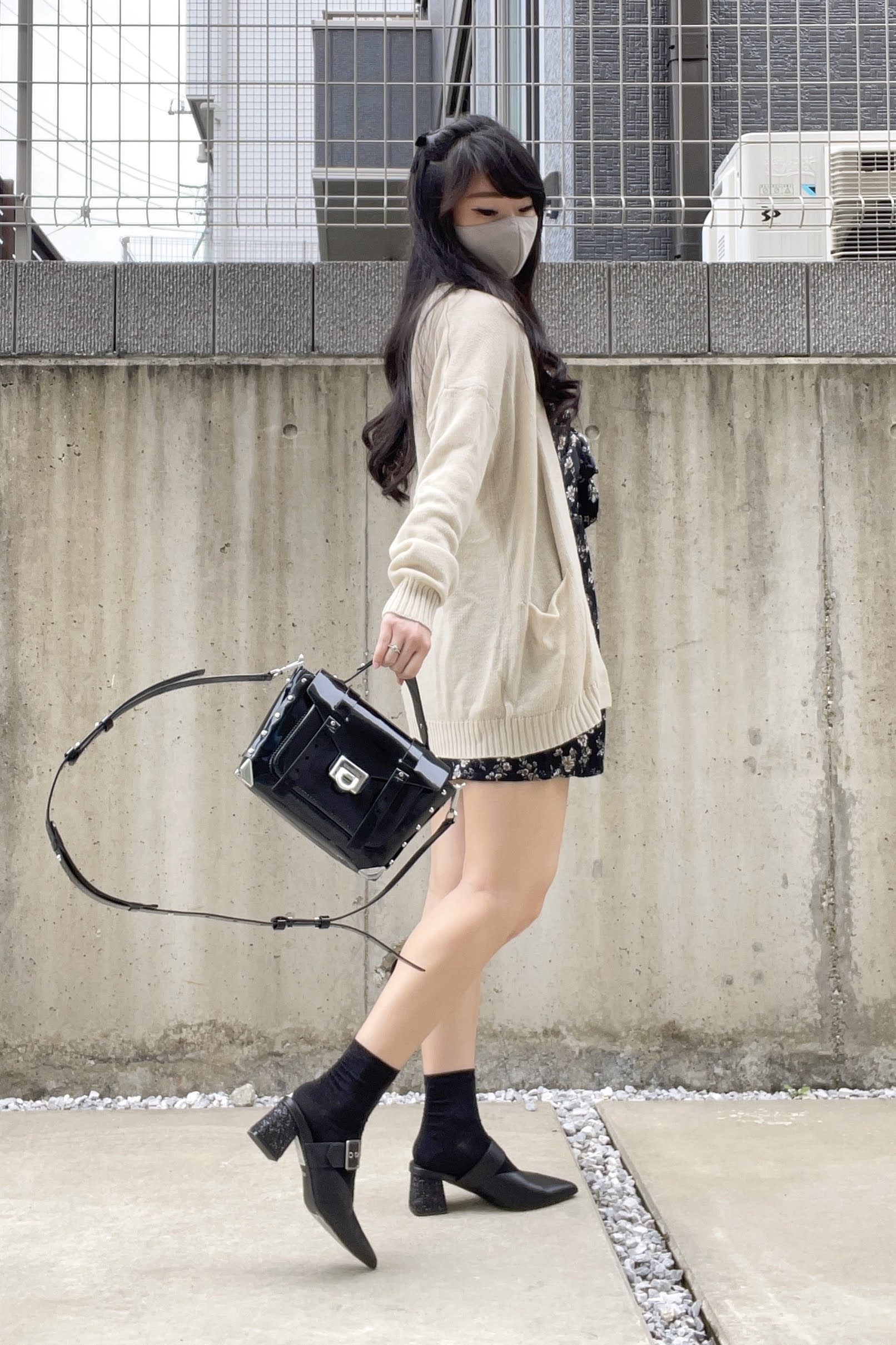 Outfit 11 (for work) - EATME sheer sleeve garter OP, EATME fukubukuro cardigan, EATME single belt sabot shoes and Dr Martens heart purse