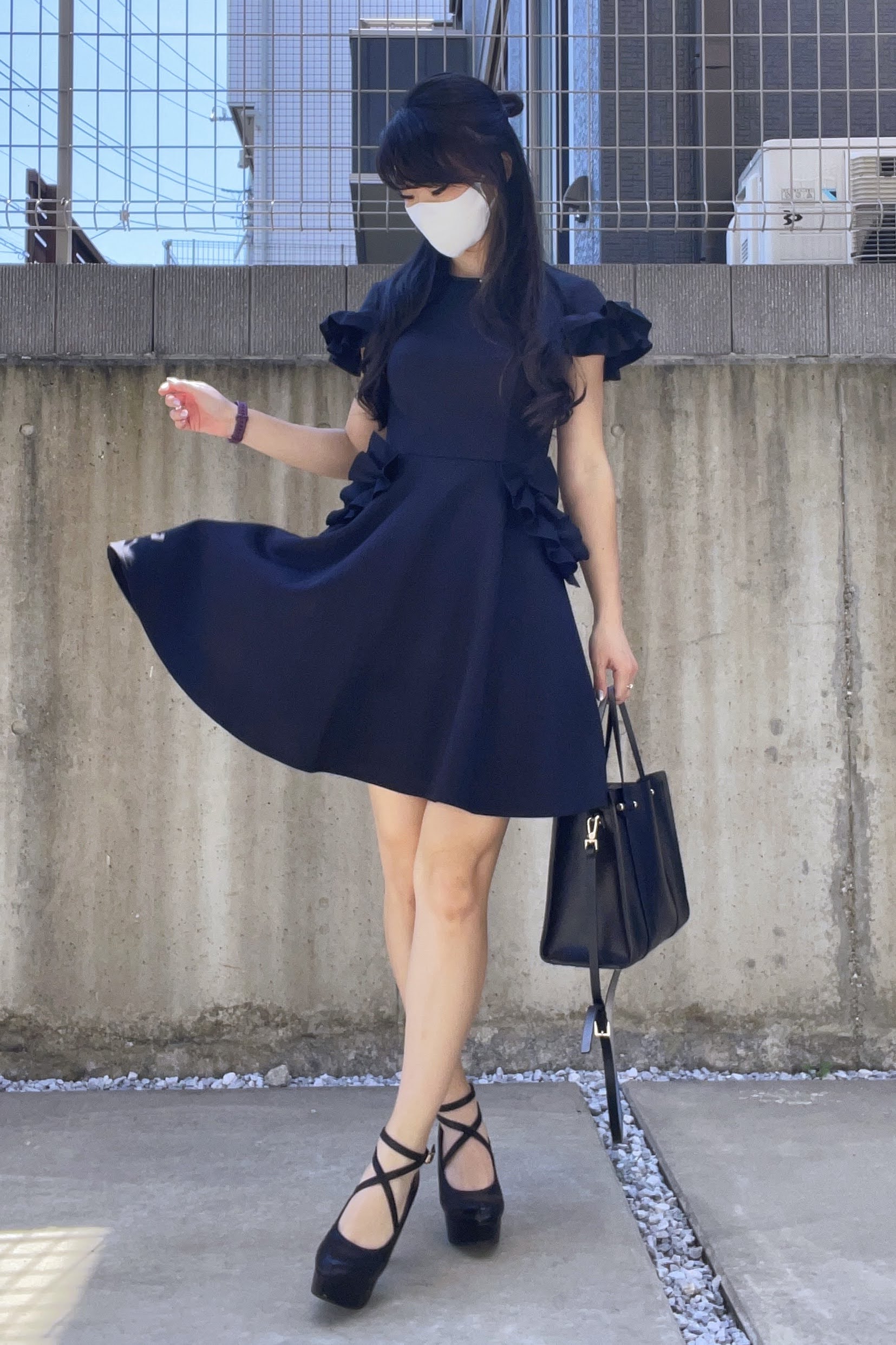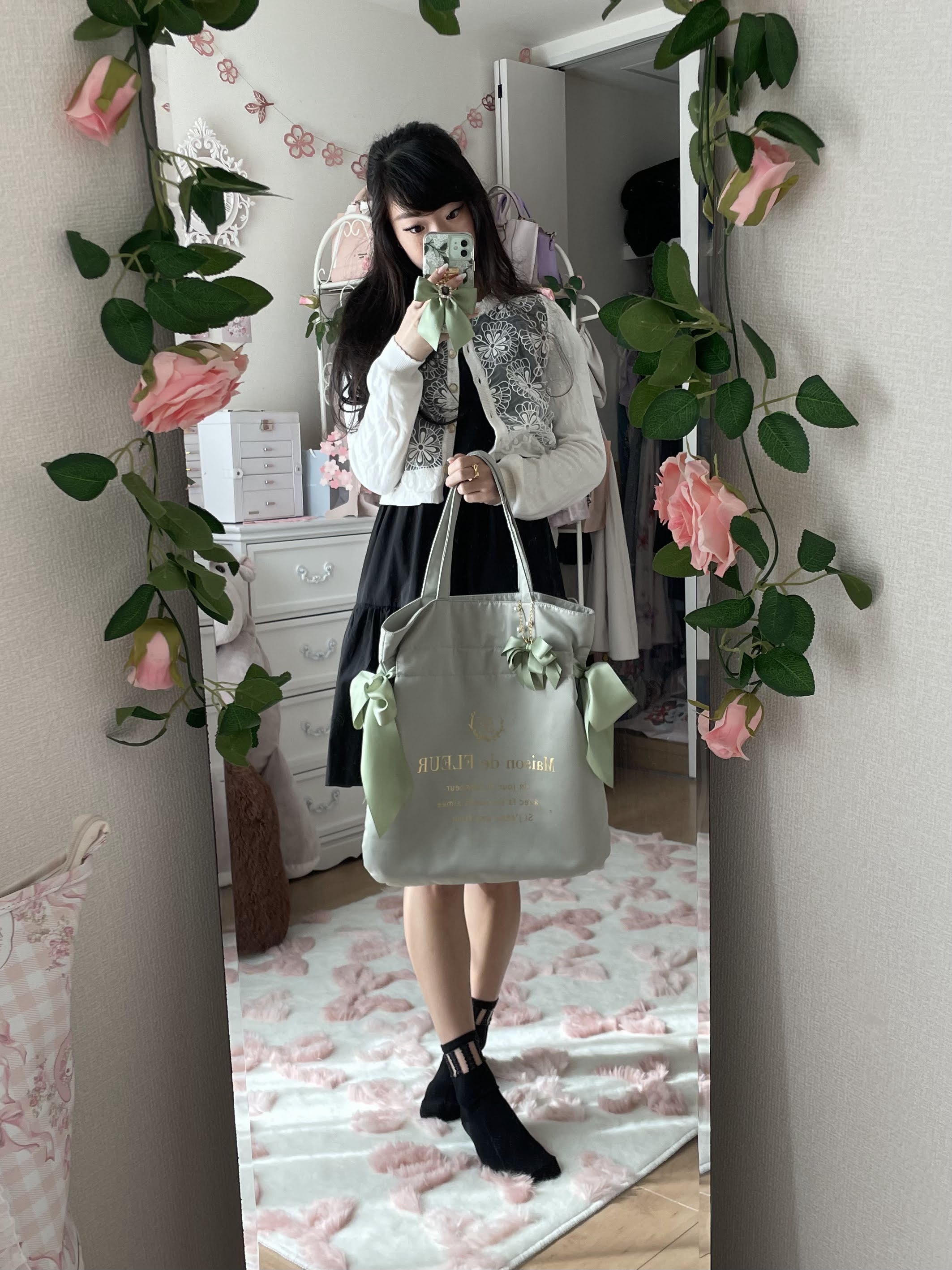 Outfit 20 (for work) - Liz Lisa flower dot OP, Liz Lisa cardigan, Liz Lisa back lace up sandals and Samantha Vega bijou ribbon purse