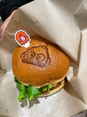 Once we were seated, I order another bun (it was pretty good lol), a chocolate donut and my husband got a hangyodon stamped ebikatsu burger with fries.
