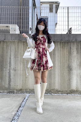 Outfit 14 (for work) - Liz Lisa floral OP, MercuryDuo mini shaggy long sleeve knit cardigan, MercuryDuo chunky heel long boots and Samantha Vega bijour ribbon purse