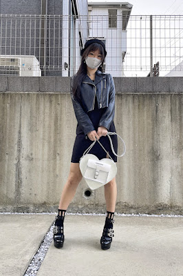 Outfit 9 (travel day to start our Nagoya weekend) - EATME single belt T OP, MercuryDuo compact faux leather riders jacket, EATME belted loafers, Dr Martens heart purse