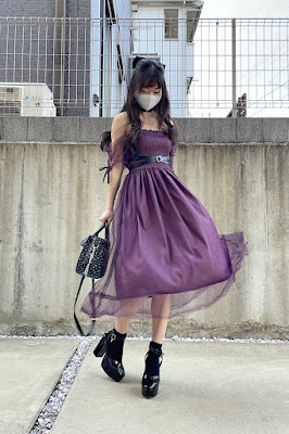 Outfit 25 (Tohoku trip start in Aomori prefecture) - EATME sheer sleeve decolette OP, EATME belted wood sandals, Michael Kors star-embellished hamilton purse