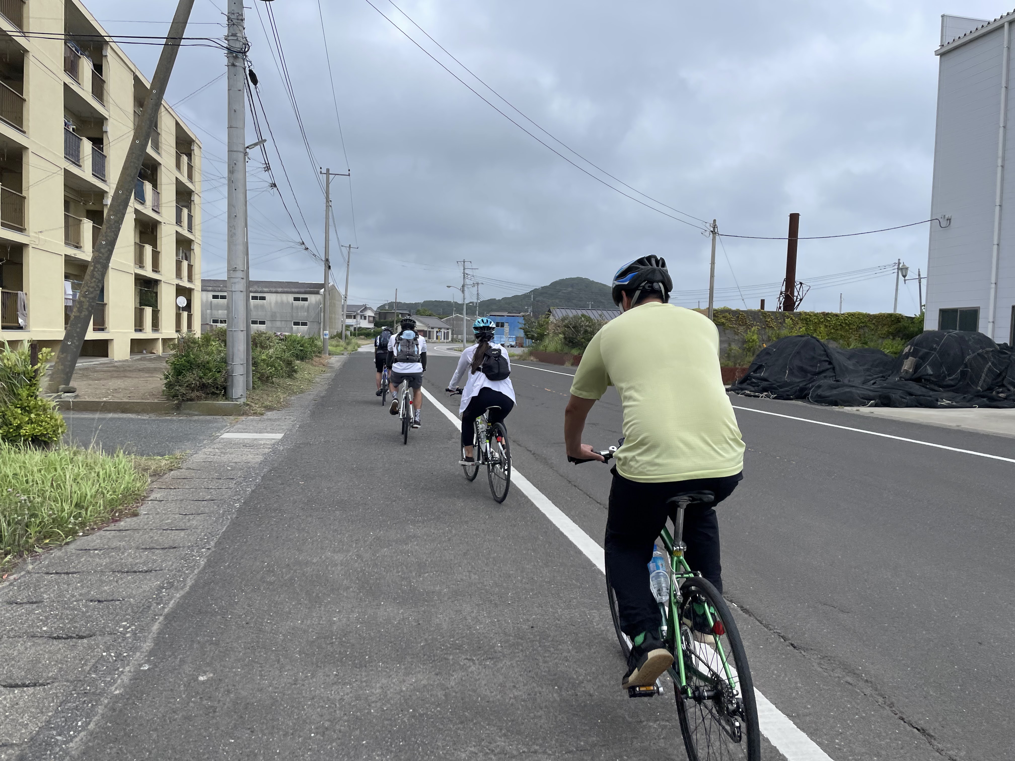 After a quick signal and safety briefing (hand/arm signals and bike in single file line, etc), we were off just before 09:00! I wasn't confident to have my phone out in the beginning, but we rode for about 20 minutes through farm land on fairly flat roads before taking a brief water break. It was really interesting to get to know the area, and Setogawa-san told us a little bit more about how this area was affected by the typhoon 3 years ago.