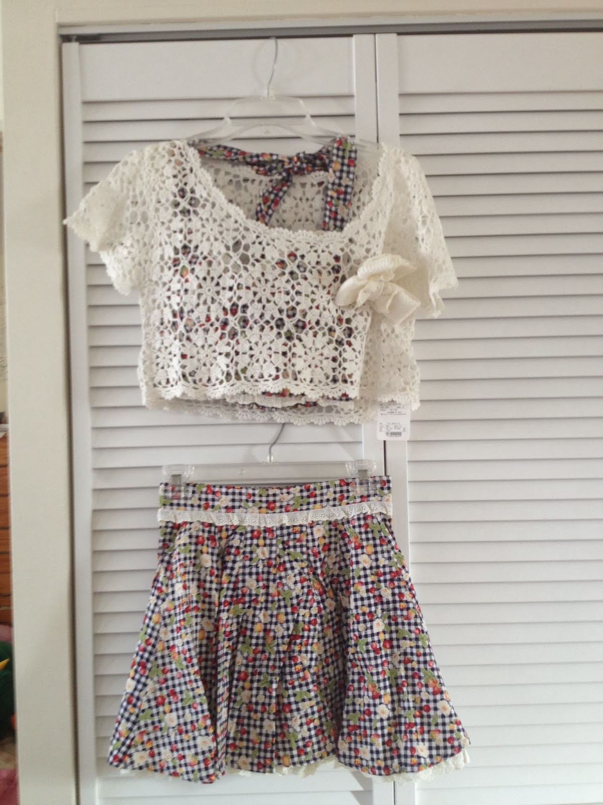 Crochet pullover with bows & Gingham/Fruit print halter top and skirt set